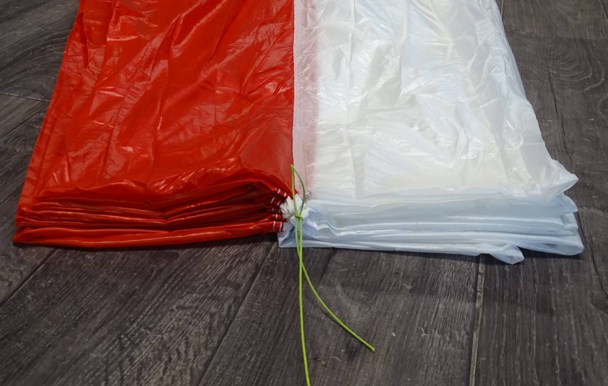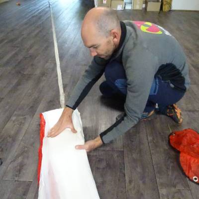 Chaque parachute possède une notice de pliage optimisée. Certaines méthodes consistent à replier le bord d’attaque puis à replier simplement le parachute sur lui-même. Sur ce modèle présenté ici le constructeur préconise un pliage en S, l’ensemble des panneaux rouges étant pliés en S par le dessus par exemple et l’ensemble des panneaux blancs en S par le dessous et ce sur toute la longueur.