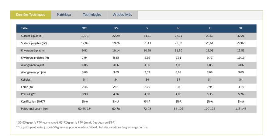 Rôle des winglets : les winglets placés sur le dessus de la voile, associés à une voûte soigneusement adaptée, stabilisent l’aile et réduisent le roulis parasite. Ils jouent également un rôle en facilitant la sortie des spirales, rendant ainsi le pilotage plus prévisible et plus agréable.