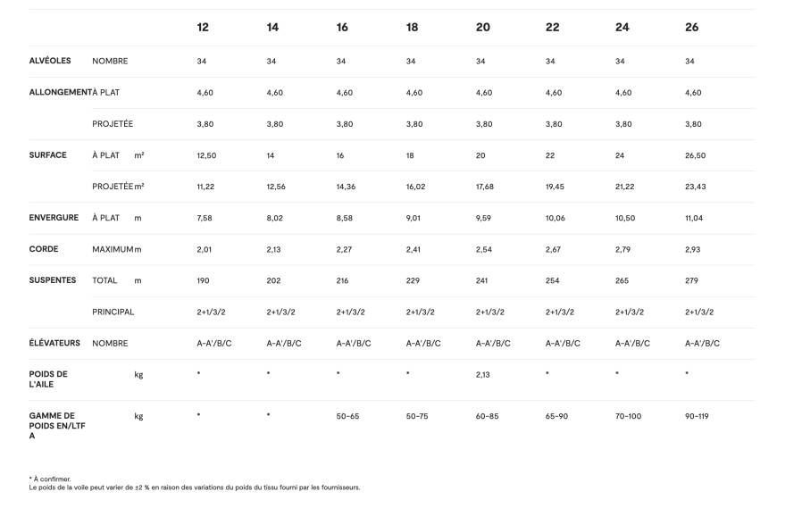Les petites tailles 12-14, ainsi que les tailles intermédiaires 16-18 lorsqu’elles sont volées près de leur charge alaire maximale, sont conçues pour des pilotes expérimentés, maîtrisant le pilotage actif. Le comportement de l’aile varie selon le poids, devenant bien plus réactif et dynamique lorsque la voile est chargée.