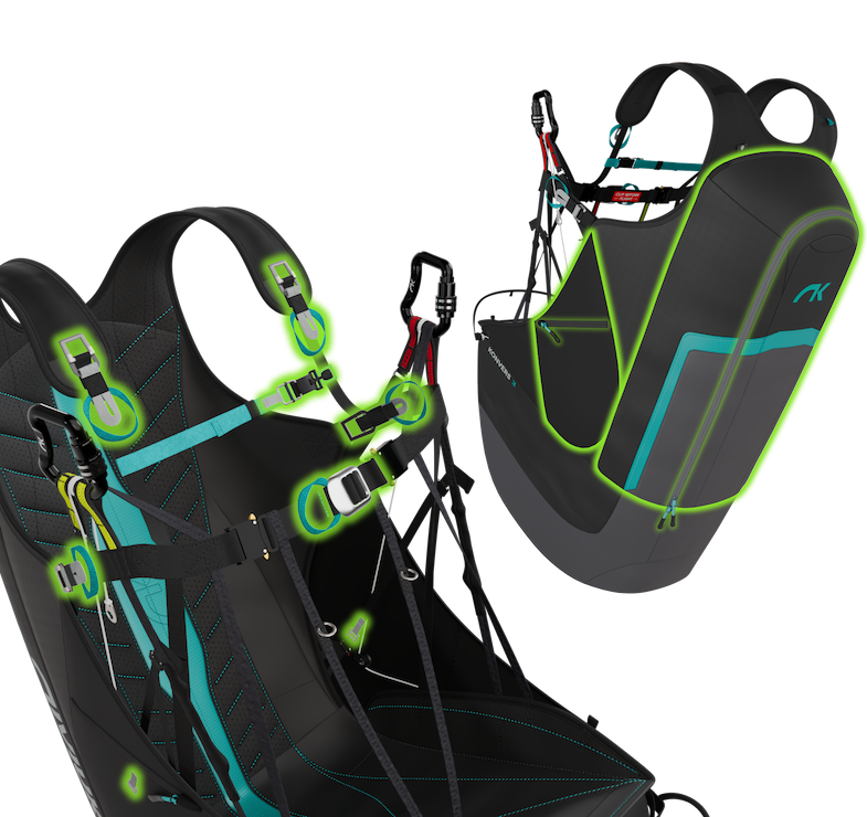 Sa conception en 3D, offrent stabilité, confort et précision. Son design favorise la liberté de mouvement. Elle est parfaite pour les vols thermiques, le gonflage et une utilisation récréative. Compacte et sûre, elle dispose d'un airbag pré-gonflé et d'une poche de parachute de secours intégré.